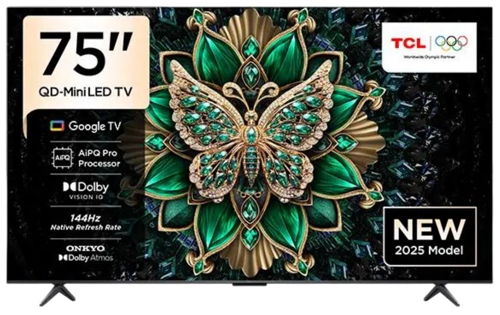 TCL 75 Inch QD Mini LED 4K Google TV – Resolution 3840 x 2160, Native Refresh Rate 144Hz , Color Gamut 93% DCI-P3, HDR Support Dolby Vision IQ, HDR10+, HLG, Contrast Ratio 5500_1, Peak Brightness up to 1000 nits. Operating System Google TV with Google Assistant. Connectivity includes 4x HDMI 2.1 (eARC/ARC), USB 2.0/3.x, Ethernet LAN, dual-band Wi-Fi, Bluetooth 5.4. Dimensions without stand_ approx. 1890 x 1086 x 57.9 mm; with stand_ 1890 x 1161 x 372 mm, Weight approx. 23 kg, VESA mount 600 x 400 mm. Warranty 3 years.