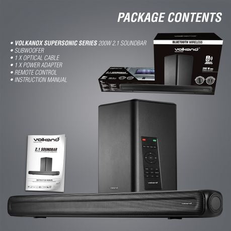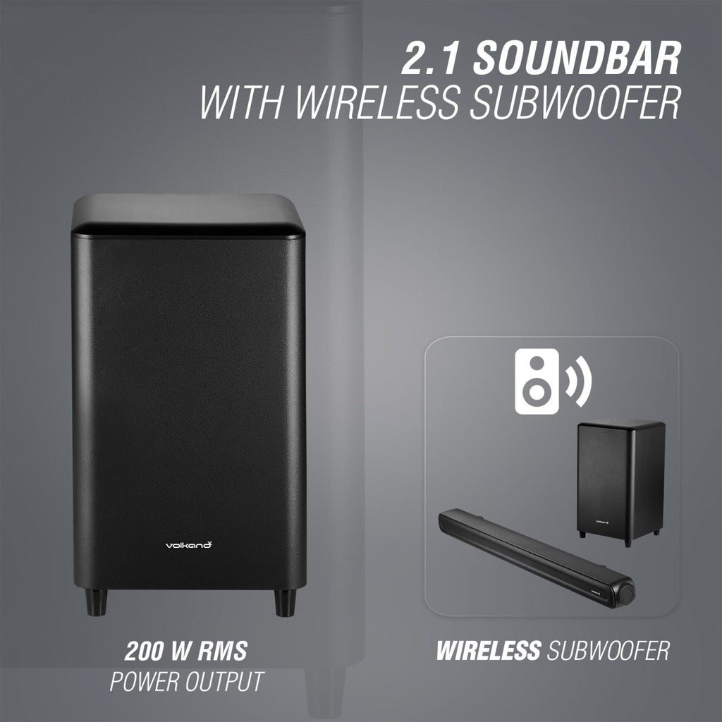 The Volkano X Supersonic Series 2.1 Soundbar System With Subwoofer - 200W, Black features a output and 2.1 Channel with up-firing drivers, this soundbar and subwoofer combo pack a punch. Perfect for the consumer who craves a real at-home cinema experience. The sub-woofer is wireless, meaning it does not need to be plugged directly into the soundbar itself in order to transmit audio.